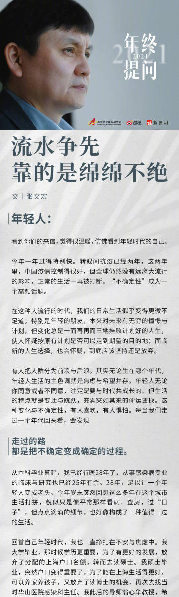 【#张文宏给年轻人的一封信#】在不确定的环境中,如何找到内心支点?即将毕业,考研和工作应该怎么选?国家传染病医学中心主任@张文宏医生 以一封回信给出他的解答。#张文宏说生活总是焦虑与希望并存#。“在每一个看似普通的选择面前保持不放弃,我们终究也都能成为这个伟大时代的一部分。”#年终提问2021#戳图,查收完整来信↓↓↓
