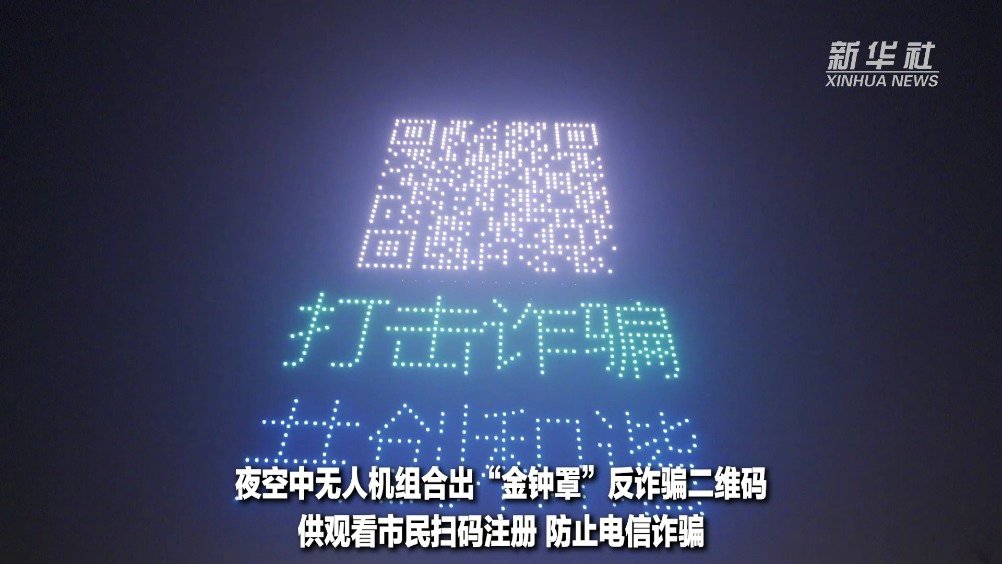 【#云南昆明千架无人机组成反诈骗二维码#】近日,云南省昆明市公园1903上空飞起千架无人机进行灯光秀表演。夜空中无人机组合出“金钟罩”反诈骗二维码,供观看市民扫码注册,预防电信诈骗。(记者王安浩维、王研,素材来源:昆明市公安局) 新华社的微博视频