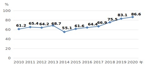 2020年,妇女常见病筛查率达到86.6%,比2010年提高25.4个百分点,实现《纲要》“达到80%以上”的目标(见图2)。