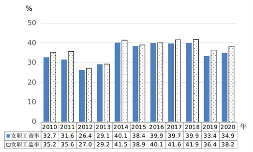 图6 2010—2020年企业职工董事和职工监事中女性所占比重