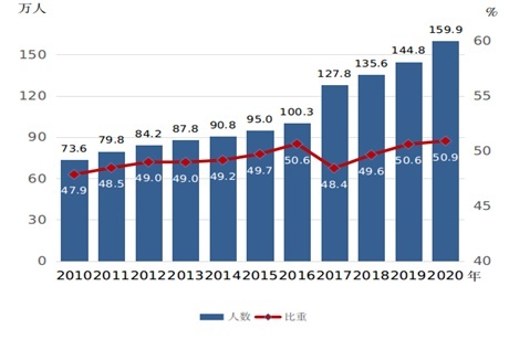2020年,高等教育毛入学率为54.4%,比2010年提高27.9个百分点。高等教育在校生中女研究生人数为159.9万人,占全部研究生的比重达到50.9%,比2010年提高3.1个百分点(见图4);普通本专科、成人本专科在校生中女生分别为1674.2万人和450.6万人,占比分别为51.0%和58.0%,分别比2010年提高0.1个和4.9个百分点。