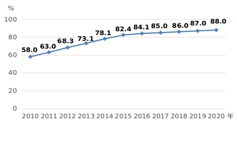 图8 2010—2020年全国农村集中式供水受益人口比重