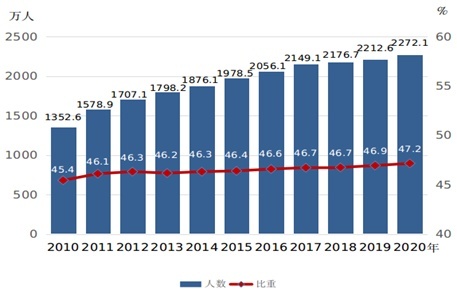 2020年末,全国女性参加基本医疗保险的人数为6.5亿人,是2011年末的3.4倍;其中,参加职工基本医疗保险的人数为1.6亿人,比2010年末增加5801.8万人,增长55.1%;参加城乡居民基本医疗保险的人数为4.9亿人,比2011年末增加4.1亿人,是2011年末的6.5倍。