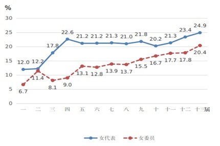 1.全国女人大代表和女政协委员占比均达历史最高。《纲要》实施以来,我国积极推动和支持妇女参政议政,妇女参与决策和管理的比例明显提高,妇女的政治权利得到有力保障和加强。