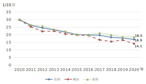 2020年,我国孕产妇死亡率为16.9/10万,比2010年降低43.7%,指标水平居全球中高收入国家前列。城市与农村孕产妇死亡率分别为14.1/10万和18.5/10万,分别比2010年降低52.5%和38.5%(见图1)。