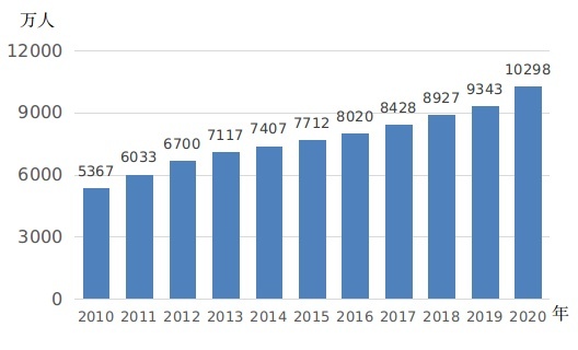 2020年末,女性参加生育保险的人数为1.03亿人,比2010年增加4931万人,是2010年的1.9倍(见图7)。