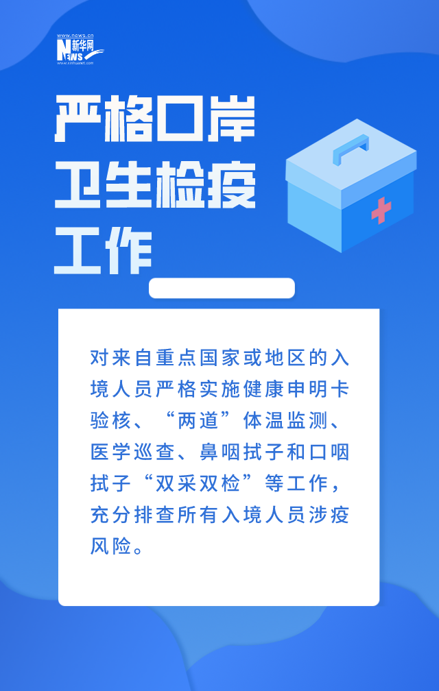在强化口岸外防输入方面,海关总署卫生检疫司副司长李政良在发布会上表示,海关将严格口岸卫生检疫工作,从严从紧做好入境交通工具登临检疫,对来自重点国家或地区的入境人员严格实施健康申明卡验核、“两道”体温监测、医学巡查、鼻咽拭子和口咽拭子“双采双检”等工作,充分排查所有入境人员涉疫风险。同时,强化与地方相关部门的沟通协作和信息共享,完善人员移交、信息通报、病例追溯等合作机制,确保入境人员全链条闭环管理。