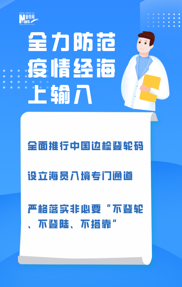 为保障国际海上物流供应链畅通,全力防范疫情经海上输入,国家移民管理局采取了全面推行中国边检登轮码;设立海员入境专门通道;严格落实非必要“不登轮、不登陆、不搭靠”的措施,确保防疫安全、保障正常作业,助力国际海上物流供应链畅通。