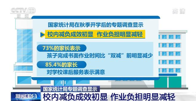 国家统计局在秋季开学后的专题调查显示,校内减负成效初显,作业负担明显减轻,73%的家长表示孩子完成书面作业时间比“双减”前明显减少,85.4%的家长对学校课后服务表示满意。学校直报平台收到了7714万份家长无记名调查问卷,97.3%的家长反映对学校减负提质工作表示满意。
