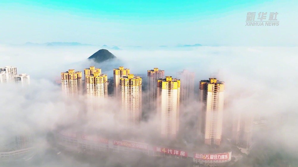 【#雾海中的这座城美极了#】冬至时节,贵州省铜仁市万山区仁山公园出现平流雾景观,高层建筑被云雾环绕,整个城市宛若仙境。 新华社的微博视频