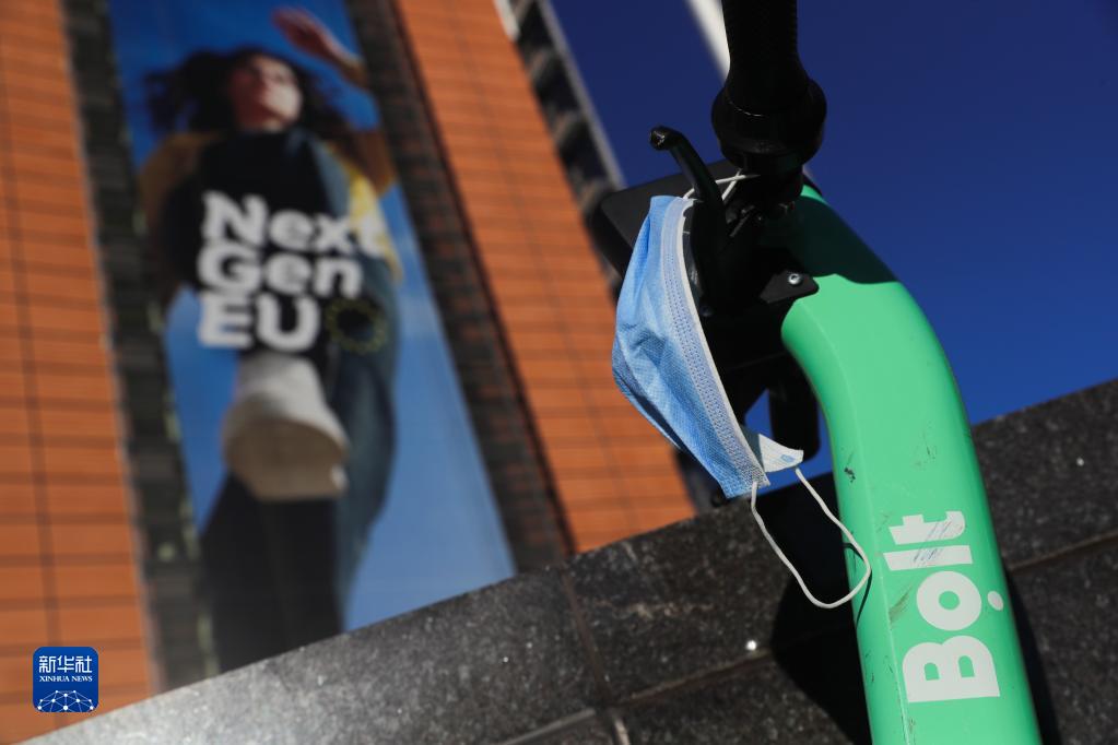 这是12月21日在比利时布鲁塞尔拍摄的挂在共享滑板车上的口罩。