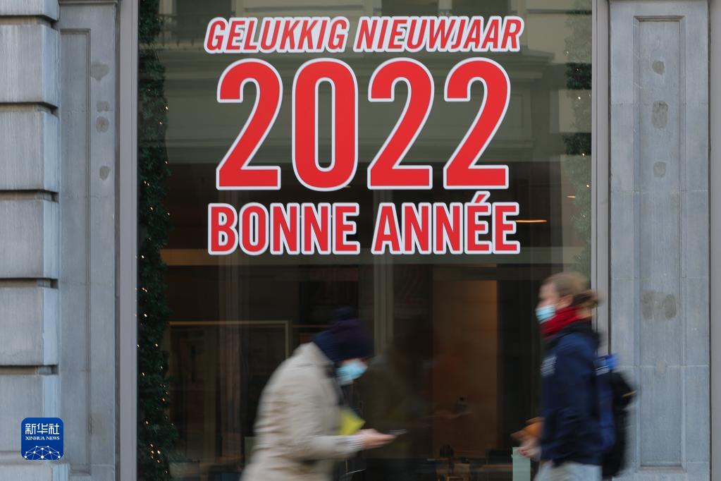 12月21日,行人经过比利时布鲁塞尔一扇贴有“2022新年好”字样的橱窗。