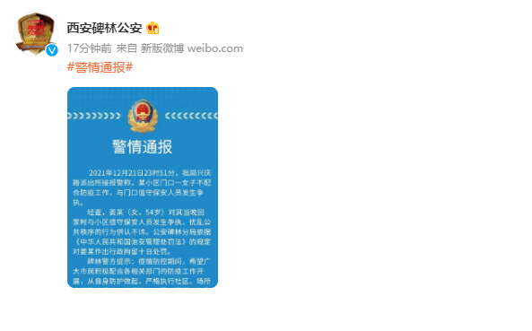 西安碑林公安消息:2021年12月21日23时51分,我局兴庆路派出所接报警称,某小区门口一女子不配合防疫工作,与门口值守保安人员发生争执。
