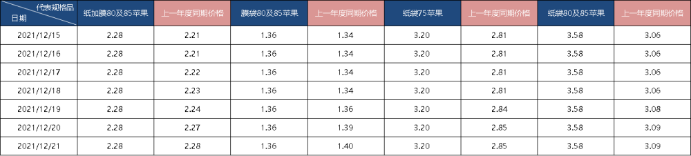 指数监测显示,截至12月21日,纸加膜80及85规格富士苹果均价为2.28元/斤,膜袋80及85规格富士苹果均价为1.36元/斤,纸袋75规格富士苹果均价为3.20元/斤,纸袋80及85规格富士苹果均价为3.58元/斤。