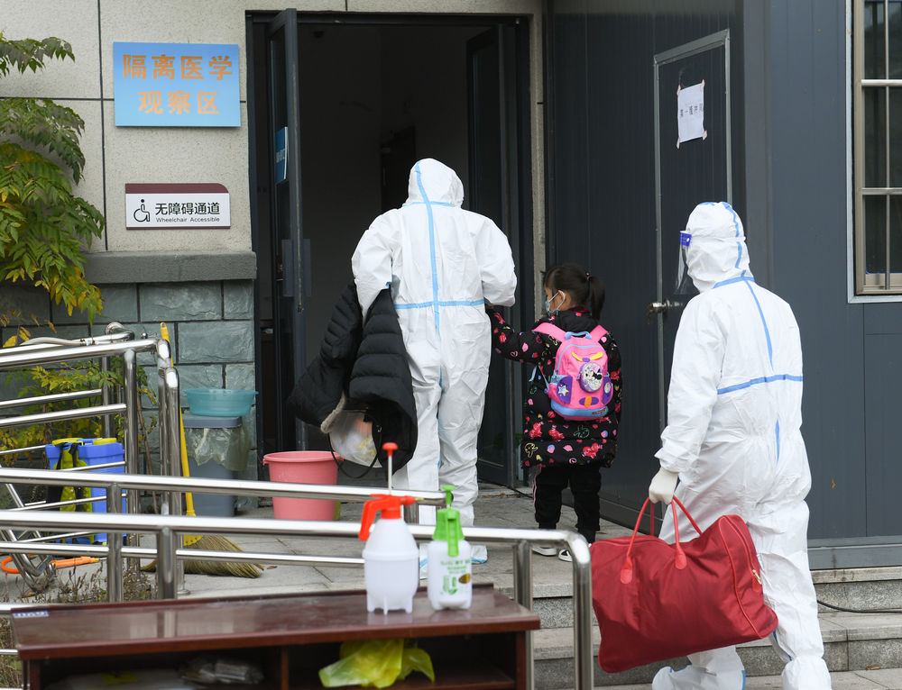 12月14日,在上虞区一处集中隔离点,医护人员将前来隔离的市民带入隔离区。