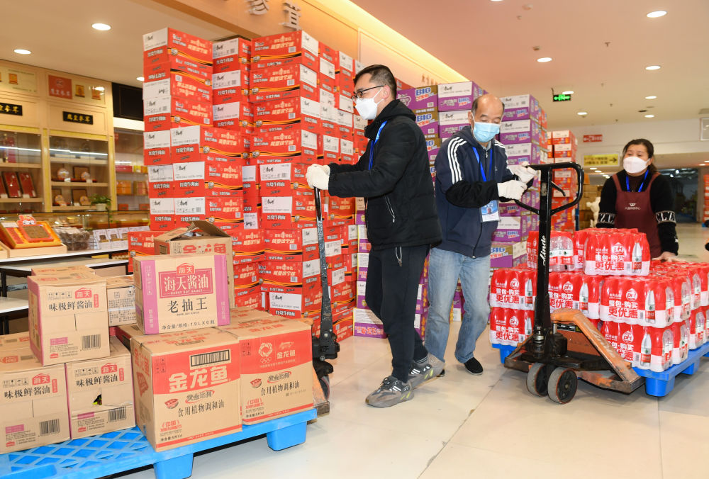 12月15日,在上虞区大通购物中心,工作人员在搬运需要配送的生活物资。疫情期间,该中心被临时征用为急需日用消费品配送中心。