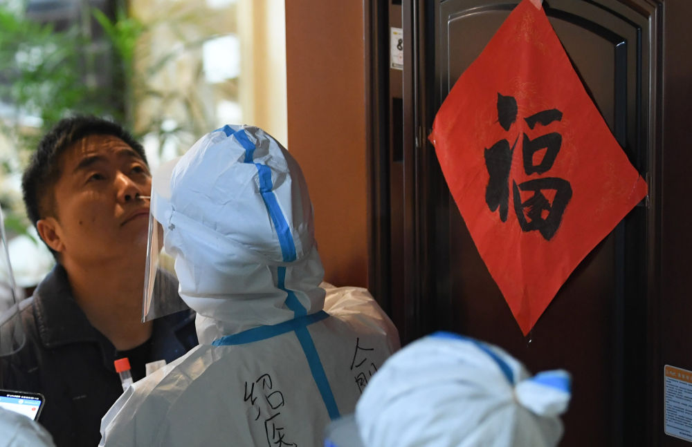 12月14日,在发现上虞首例确诊病例的阳光假日小区,医护人员对居民进行例行核酸采样。