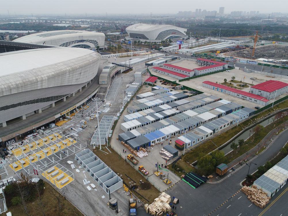 12月14日,可容纳2500人的上虞体育中心临时隔离点正在建设中。