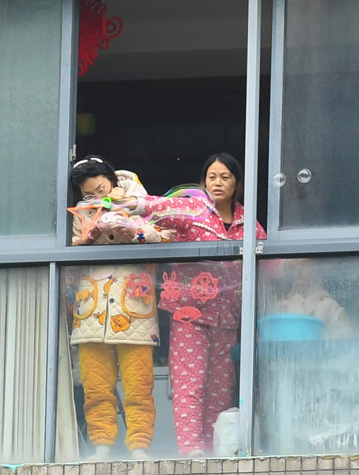 12月14日,在发现上虞首例确诊病例的阳光假日小区,一户居家隔离的市民在窗口玩泡泡。