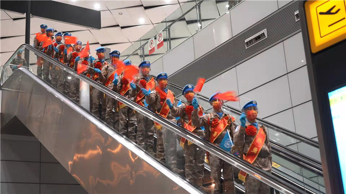 | 维和官兵挥舞国旗进入候机大厅。维和步兵营供图 |