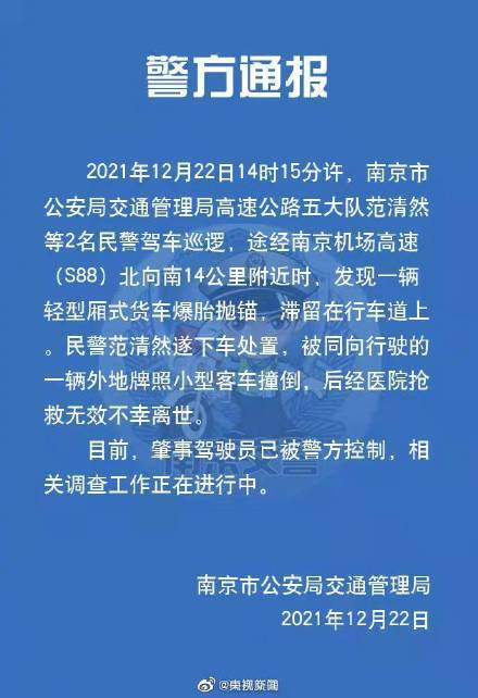 今天14时15分许,南京市公安局交通管理局高速公路五大队范清然等2名民警驾车巡逻,途经南京机场高速(S88)北向南14公里附近时,发现一辆轻型厢式货车爆胎抛锚,滞留在行车道上。民警范清然遂下车处置,被同向行驶的一辆外地牌照小型客车撞倒,后经医院抢救无效不幸离世。目前,肇事驾驶员已被警方控制,相关调查工作正在进行中。