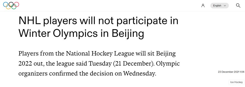 贝特曼说:“北美职业冰球联赛尊重且赞赏NHL球员代表本国参加‘最强赛事’的意愿。为此,我们已经等待了尽可能长的时间来探索所有可能的选项来促使球员们有机会参加2022年冬奥会。不幸的是,最近新冠肺炎相关事件对北美职业冰球联赛常规赛季赛程造成了严重的影响,截至12月23日已有50场比赛被推迟,因此,参加北京冬奥会已不再可行。我们非常认可也非常感谢国际奥委会、国际冰球联合会和北京冬奥组委为准备接待NHL球员所做的所有工作,但是,尽管大家都做出了最大的努力,目前的情况使得我们无法参加。我们期待能参加下一届冬奥会。”