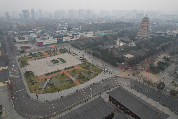 暂时关闭的西安大雁塔南广场(无人机照片)。新华社记者 邵瑞 摄