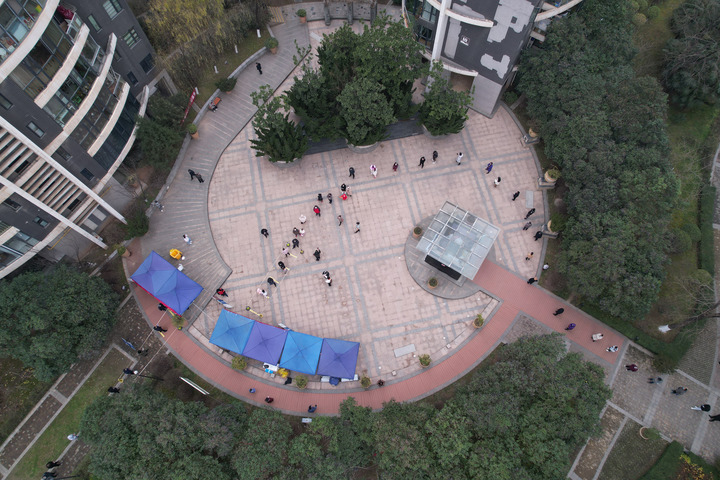 12月23日,在西安曲江南苑小区内,居民排队进行核酸检测(无人机照片)。新华社记者 邵瑞 摄