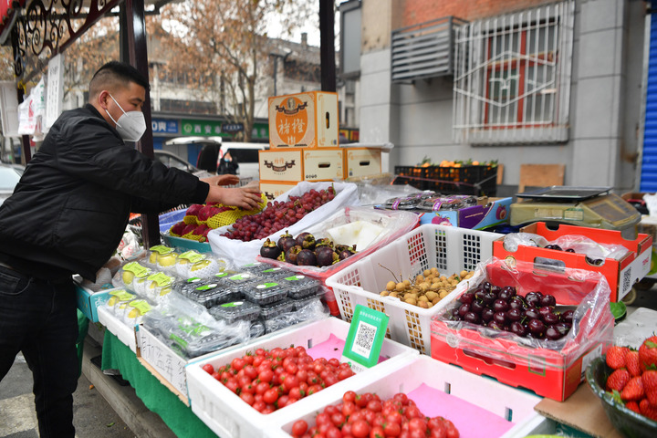 12月23日,西安市莲湖区一处便民市场,摊主在整理水果。新华社记者 张博文 摄