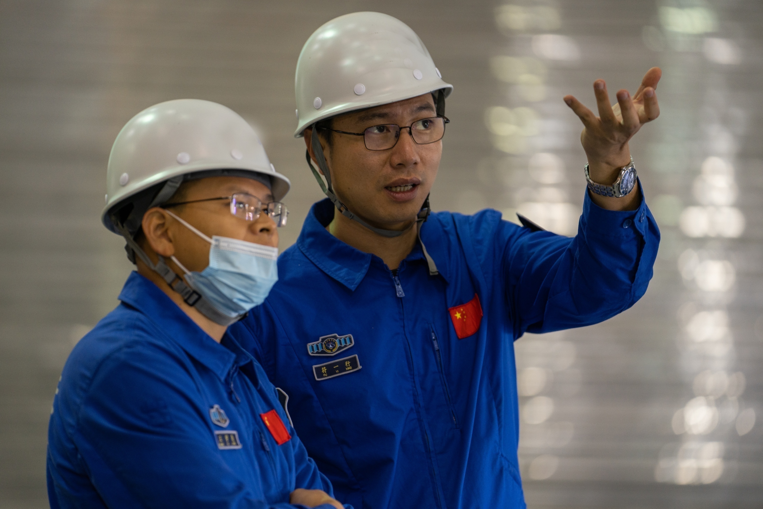 符一行(右)和同事在厂房讨论。李汶骏 都鑫鑫 摄