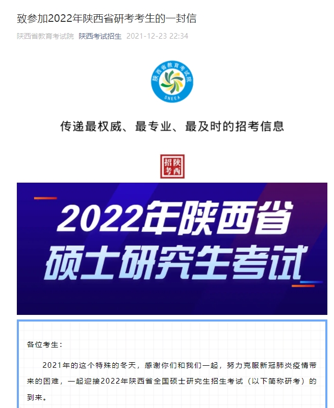 12月23日,陕西省教育考试院微信公号发布《致参加2022年陕西省研考考生的一封信》,原文如下↓