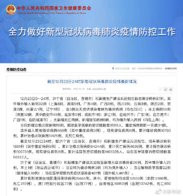 截至12月23日24时,据31个省(自治区、直辖市)和新疆生产建设兵团报告,现有确诊病例1851例(其中重症病例9例),累计治愈出院病例94244例,累计死亡病例4636例,累计报告确诊病例100731例,现有疑似病例8例。累计追踪到密切接触者1401028人,尚在医学观察的密切接触者56557人。