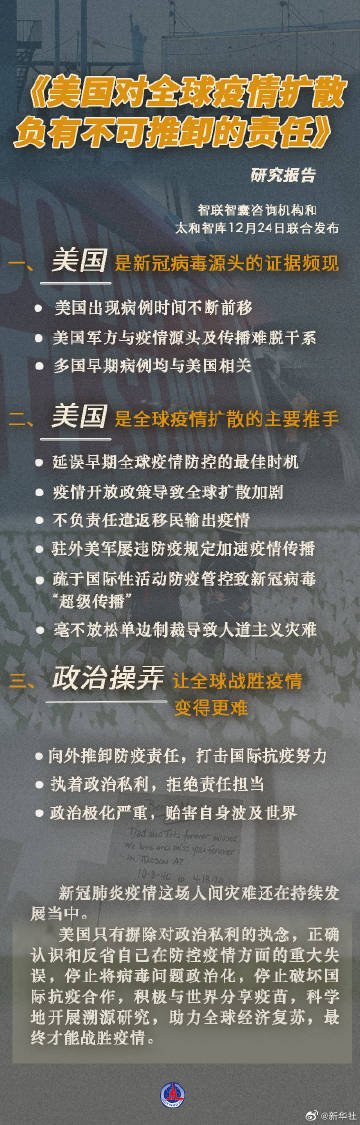 #美国是导致疫情全球快速扩散的罪魁祸首#【疫情全球快速扩散,美国难辞其咎!】智联智囊咨询机构和太和智库12月24日联合发布《#美国对全球疫情扩散负有不可推卸的责任#》研究报告。报告指出,多项数据和信息显示,美国才最有可能是新冠病毒的“起源国”,是导致疫情在全球快速扩散的罪魁祸首,而美国的政治化操弄更是让全球战胜疫情步履维艰,面临严重挑战。一张长图,看美国到底做错了什么⬇(记者孙楠、王宾)