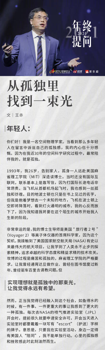 【王赤院士给年轻人的一封信】选择少有人走的路,#如何克服人生的孤独感#?奔向星辰大海的路上,怎么克服外界诱惑?中国科学院院士王赤回信作答,讲述他如何走上科研之路。#院士教年轻人如何克服孤独感#。他说,孤独是人生常态,要学会和孤独相处,并借此认清自己内心真正想要的东西。#年终提问2021#戳图,查收完整来信↓↓↓
