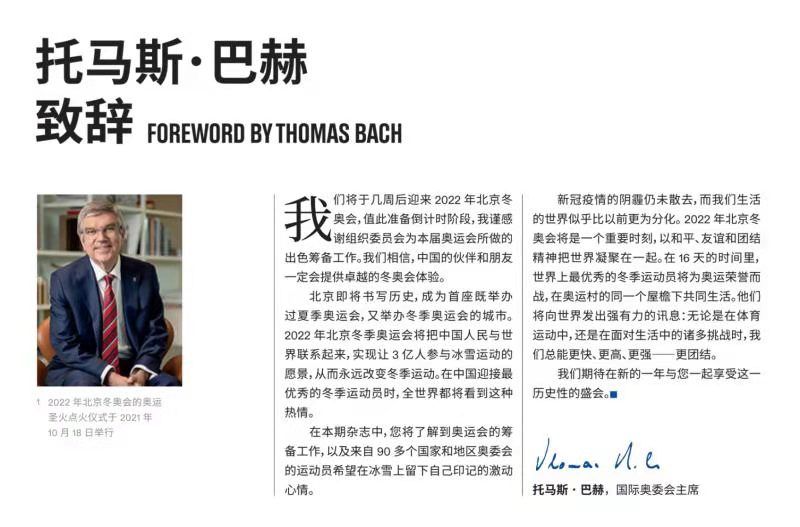 “新冠疫情的阴霾仍未散去,而我们生活的世界似乎比以前更为分化。2022年北京冬奥会将是一个重要时刻,以和平、友谊和团结精神把世界凝聚在一起。在16天的时间里,世界上最优秀的冬季运动员将为奥运荣誉而战,在奥运村的同一个屋檐下共同生活。他们将向世界发出强有力的讯息:无论是在体育运动中,还是在面对生活中的诸多挑战时,我们总能更快、更高、更强——更团结。我们期待在新的一年与您一起享受这一历史性的盛会。”