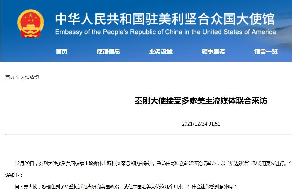 来源:中国驻美国大使馆网站 原标题为:秦刚大使接受多家美主流媒体联合采访