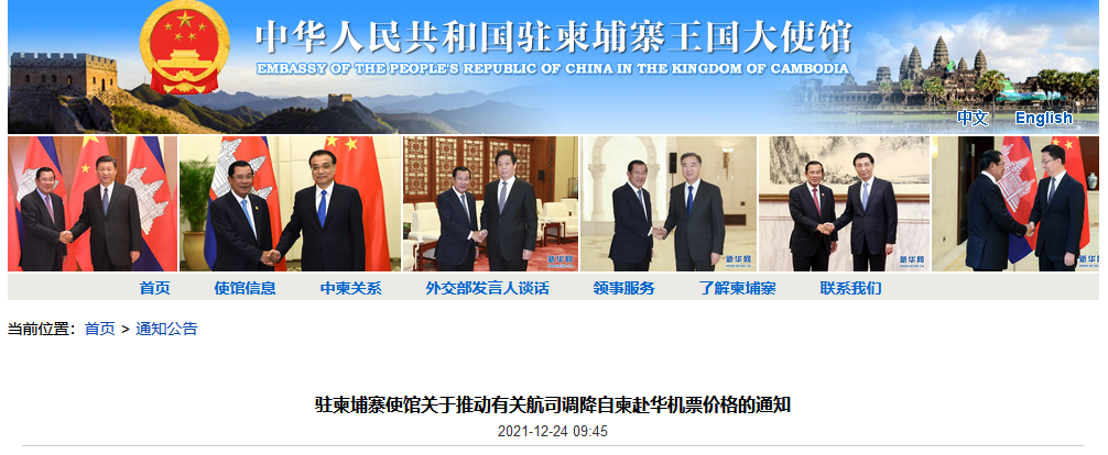 中国驻柬埔寨大使馆网站12月24日发布关于推动有关航司调降自柬赴华机票价格的通知。通知表示,继调减中国公民回国核酸检测费用及整顿赴华航班隔离和机票乱象后,我馆继续本着“外交为民”理念,积极争取柬埔寨航空公司(目前惟一执飞自柬赴华航班)同意于2022年2月1日起调降机票价格,具体安排如下: