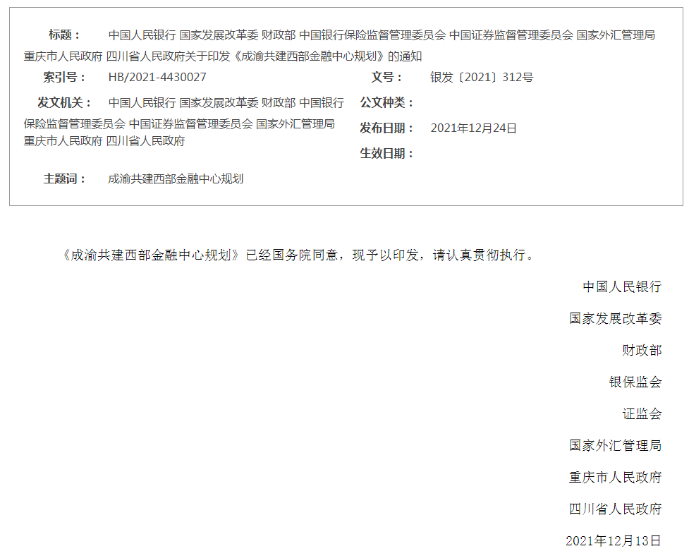 中国人民银行 国家发展改革委 财政部 中国银行保险监督管理委员会 中国证券监督管理委员会 国家外汇管理局 重庆市人民政府 四川省人民政府关于印发《成渝共建西部金融中心规划》的通知