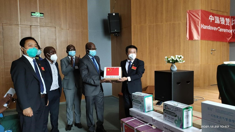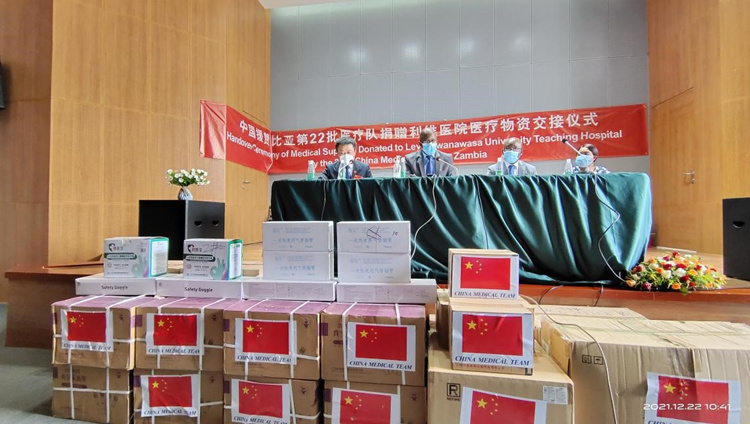 中国援赞医疗队向赞比亚利维医院捐赠医疗防疫物资。援赞比亚第22批医疗队供图