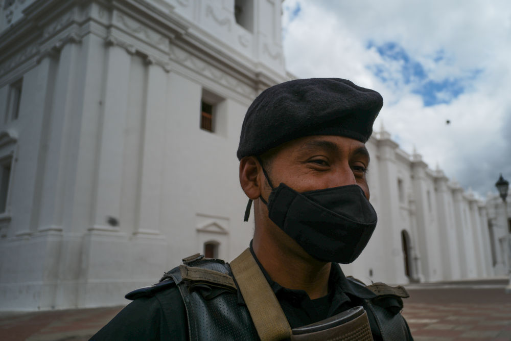 12月15日,在尼加拉瓜莱昂,一名警察站在莱昂大教堂前执勤。