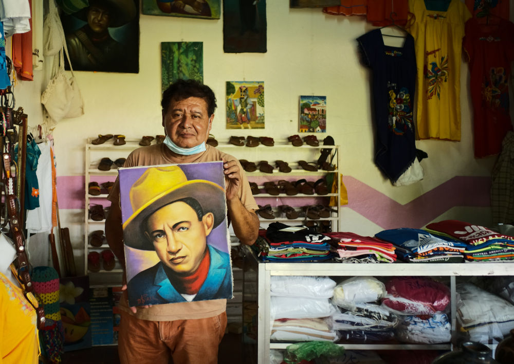 12月12日,在尼加拉瓜马萨亚省,一家商店的主人展示一幅尼加拉瓜民族英雄桑地诺的画像。