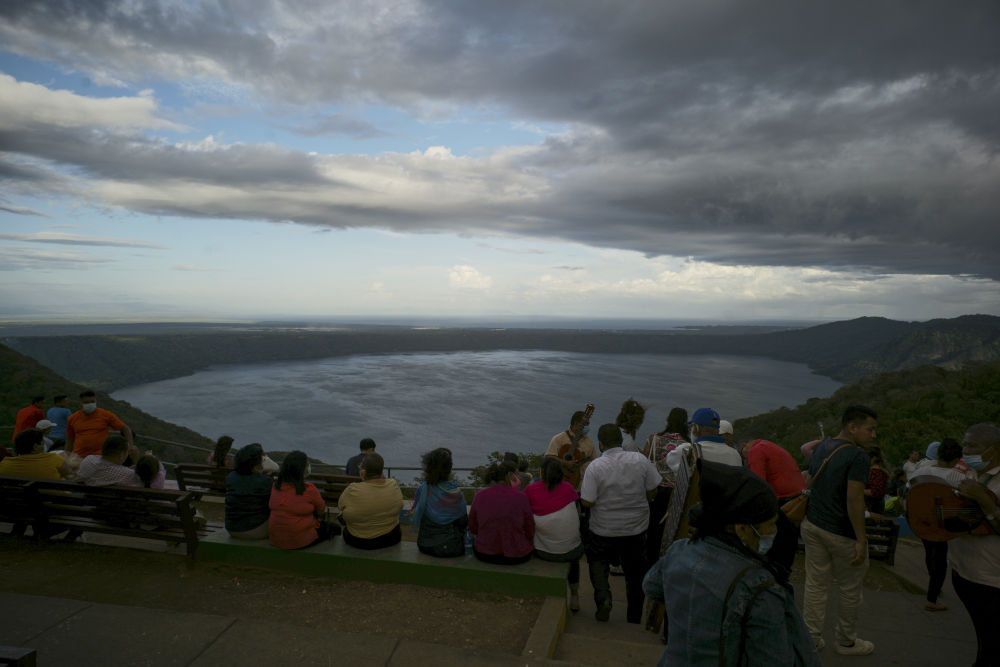 12月12日,在尼加拉瓜马萨亚省卡塔琳娜,游客在观赏一处火山湖。
