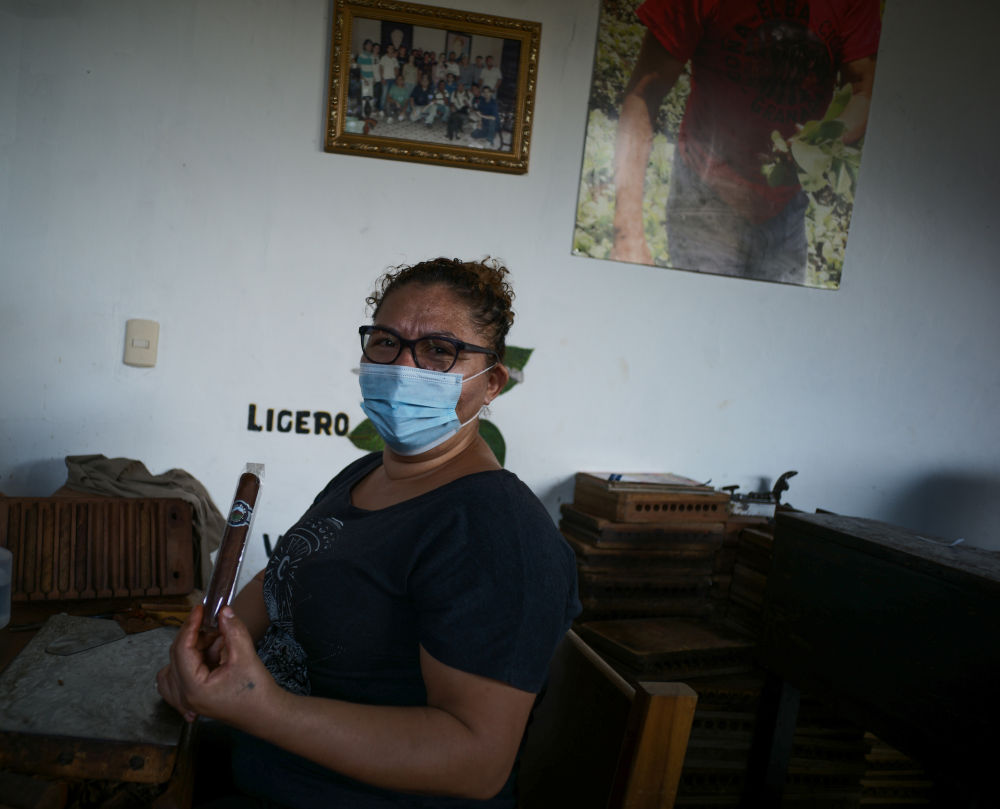 12月16日,在尼加拉瓜格拉纳达省的一家雪茄工厂,一名工人在展示制作完成的手工雪茄。