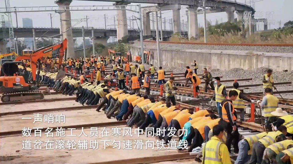 #寒冬里的施工大协作#【广西南宁#百吨道岔大挪移精度达毫米级别#】近日,在广西南宁动车所屯里桥群附近,500余名铁路工人上演了一场“百吨道岔大挪移”。该组交渡道岔全长93.7米,重约250吨,施工人员需将其向既有线路内侧横移12.5米。此次施工技术方案复杂、安全风险及施工难度大。但一声哨响,数百名施工人员同时发力,30秒内道岔便被平稳推移至指定位置,精准度达毫米级别。(记者杨驰,素材来源:中国铁路南宁局集团有限公司) 新华社的微博视频