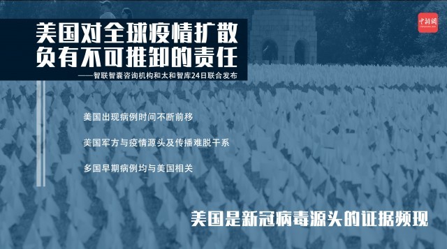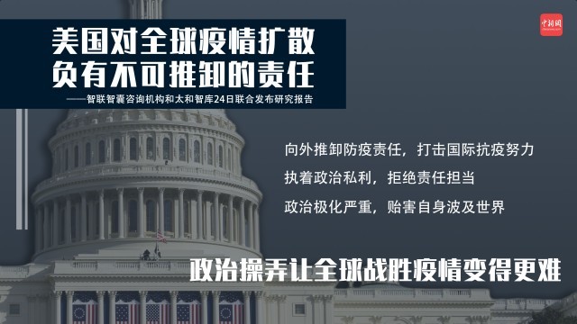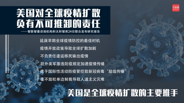 中新网北京12月25日电 (蒋鲤)新冠肺炎疫情是一场肆虐全球的公共卫生危机,需要世界各国共同应对。但是,美国政府不仅没有承担起应负的国际责任,还对全球抗疫造成了破坏性影响。24日,智联智囊咨询机构和太和智库联合发布研究报告《美国对全球疫情扩散负有不可推卸的责任》,报告指出,多项数据和信息显示,美国才最有可能是新冠病毒的“起源国”,是导致疫情在全球快速扩散的罪魁祸首,而美国的政治化操弄更是让全球战胜疫情步履维艰,面临严重挑战。