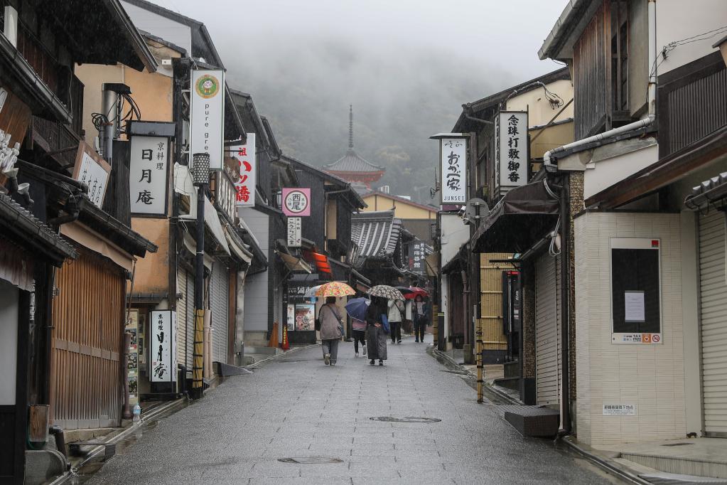 4月29日,在日本京都,清水寺附近的商业街上游人稀少,店铺暂停营业。新华社记者杜潇逸摄