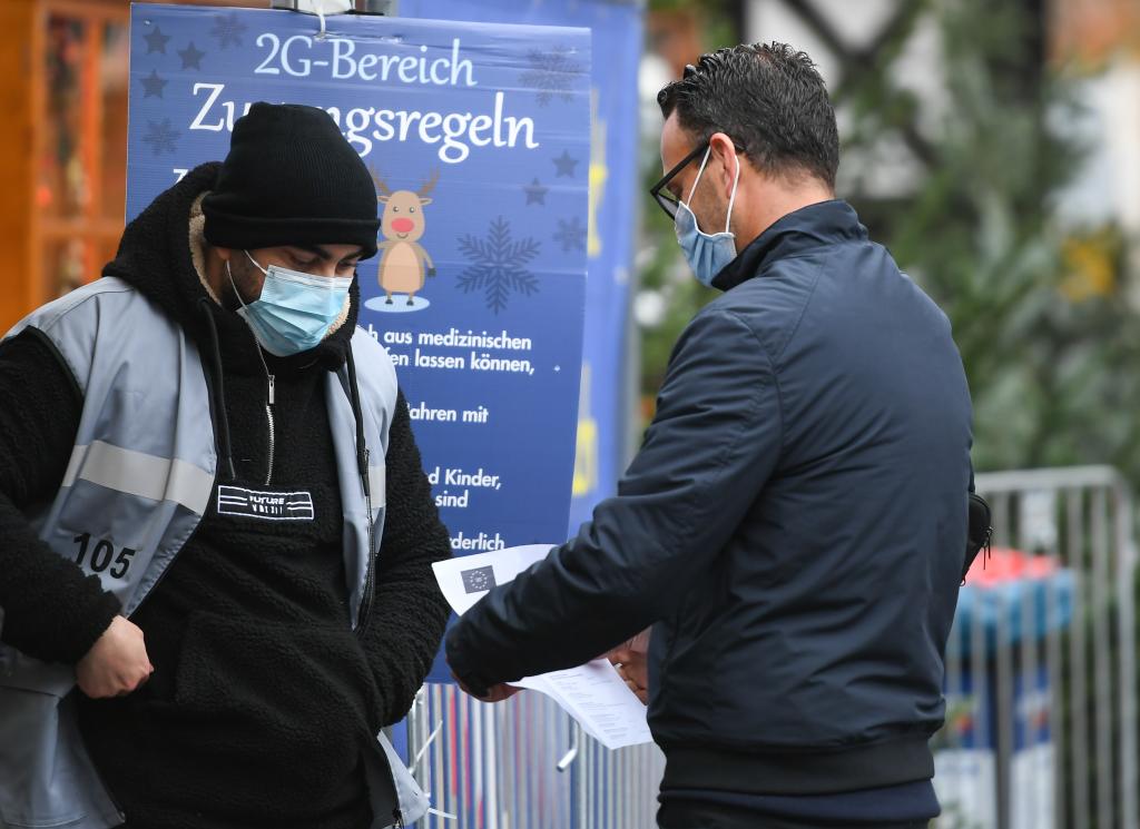 12月3日,工作人员(左)在德国法兰克福圣诞市场外检查游客的健康通行证。新华社记者逯阳摄