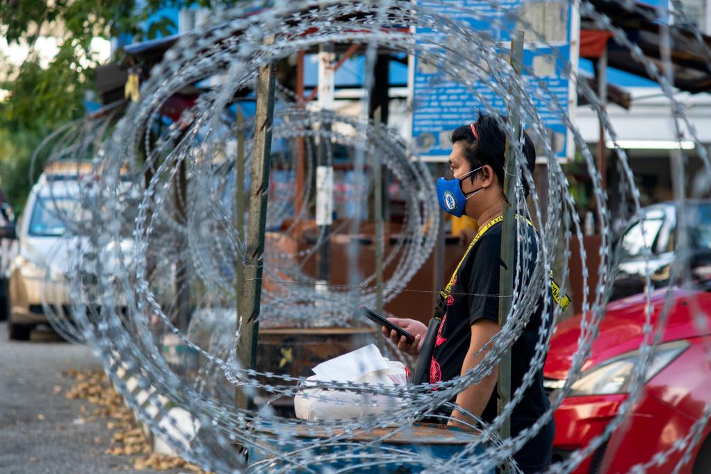 7月23日,在马来西亚吉隆坡一个实行“加强行动管制令”的社区,一名居民隔着铁丝网向外张望。新华社发(张纹综摄)