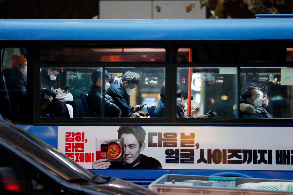 11月29日,佩戴口罩的市民在韩国首尔乘坐公交车。新华社记者王益亮摄