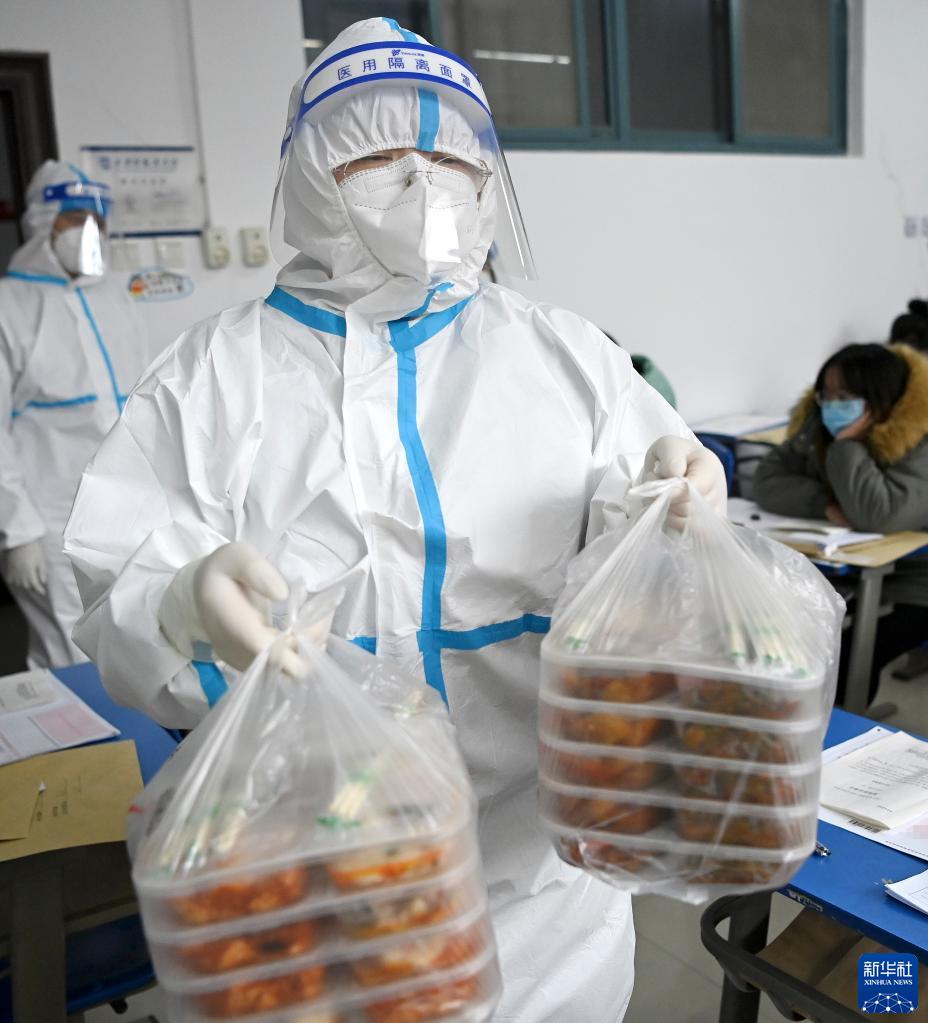 12月25日,在2022年全国硕士研究生招生考试西安外国语大学考点隔离考区,监考人员为考生送午饭。新华社记者 刘潇 摄
